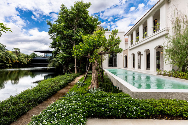 A striking staircase serves as the main access to the clubhouse, offering a grand and photogenic welcome for residents and guests alike. On the first floor, a long, elegant swimming pool and a communal living room are positioned on either side of a central corridor that leads directly to the landscaped garden area, creating a seamless indoor-outdoor experience. Upstairs, the second floor features a fully equipped fitness room, enclosed by expansive windows that invite natural light and connect the interior to the surrounding greenery—enhancing both the ambiance and the workout experience.